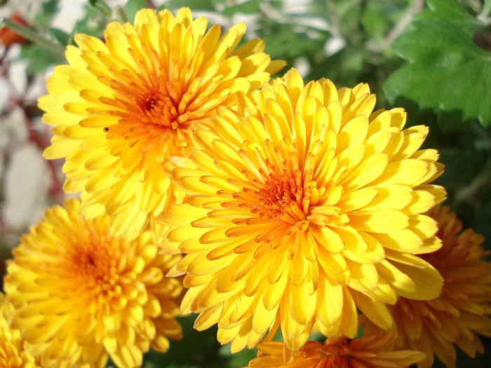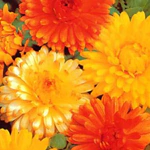 Flores grandes e dobradas, em tons vibrantes de amarelo, laranja e, ocasionalmente, branco ou rosa