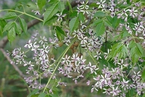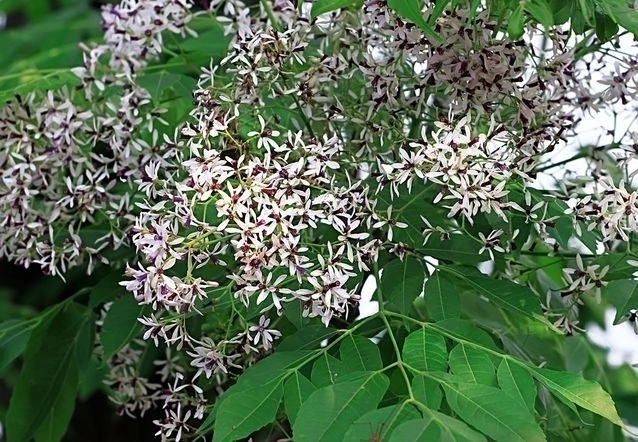 • Flores pequenas, brancas ou rosa-pálidas, agrupadas em panículas vistosas