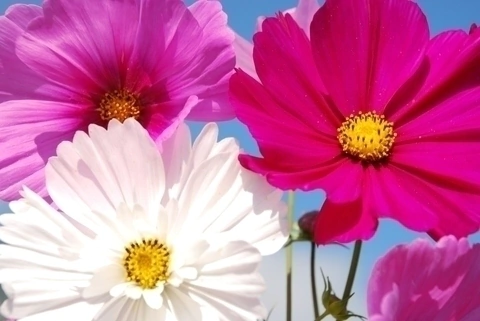Flores de até 10 cm, em tons variados de branco, rosa, vermelho, roxo e laranja