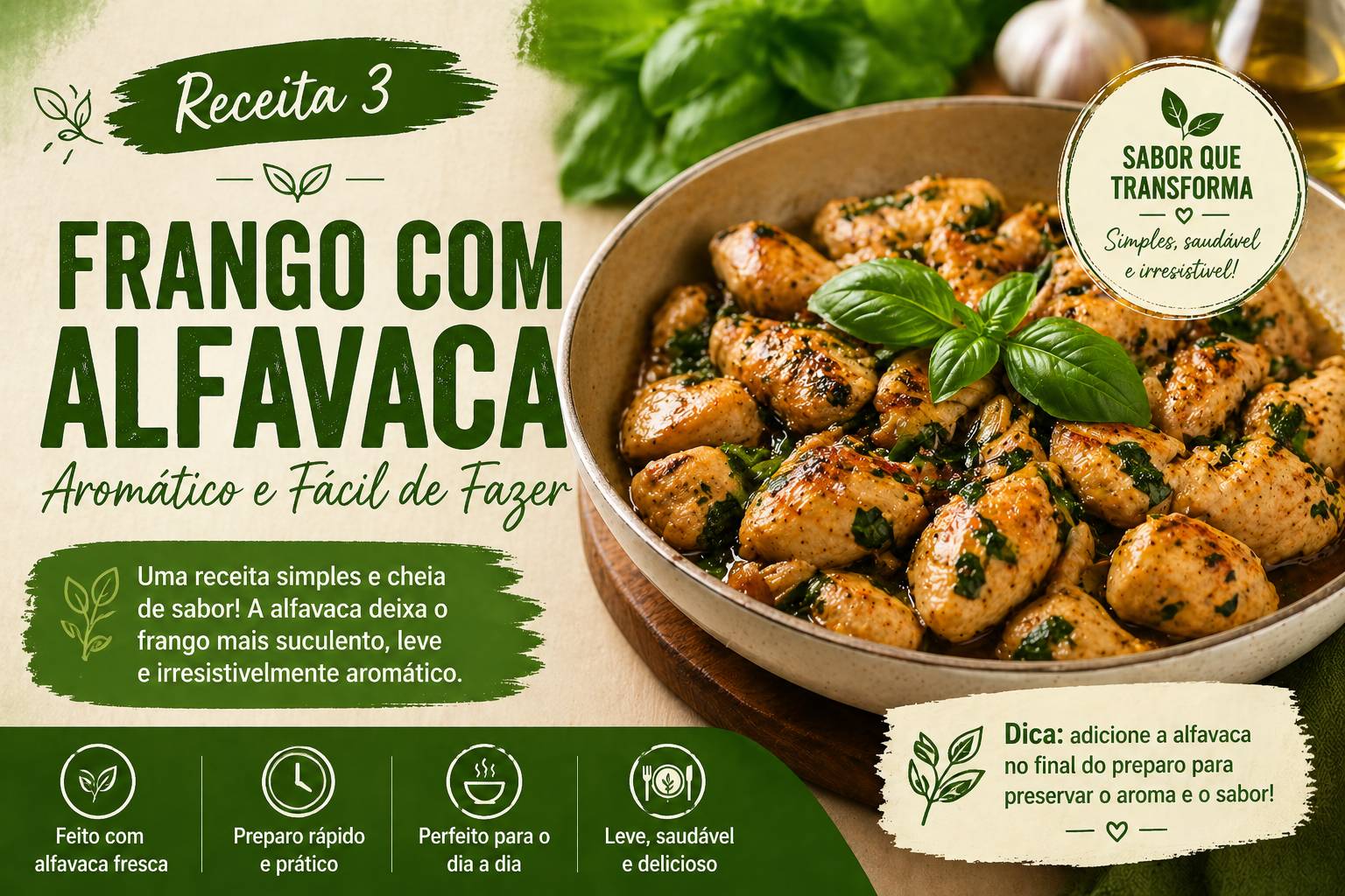O frango com alfavaca é uma receita simples, saborosa e muito aromática. A erva traz um toque especial ao prato, deixando a carne mais leve e perfumada. Ideal para o dia a dia.
