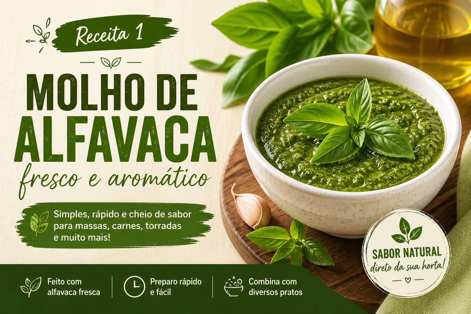 O molho de alfavaca é uma forma prática e deliciosa de usar folhas frescas dessa erva aromática. Com sabor marcante e preparo rápido, é perfeito para massas, carnes e até torradas.